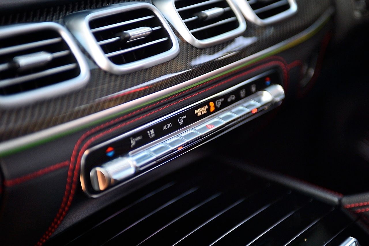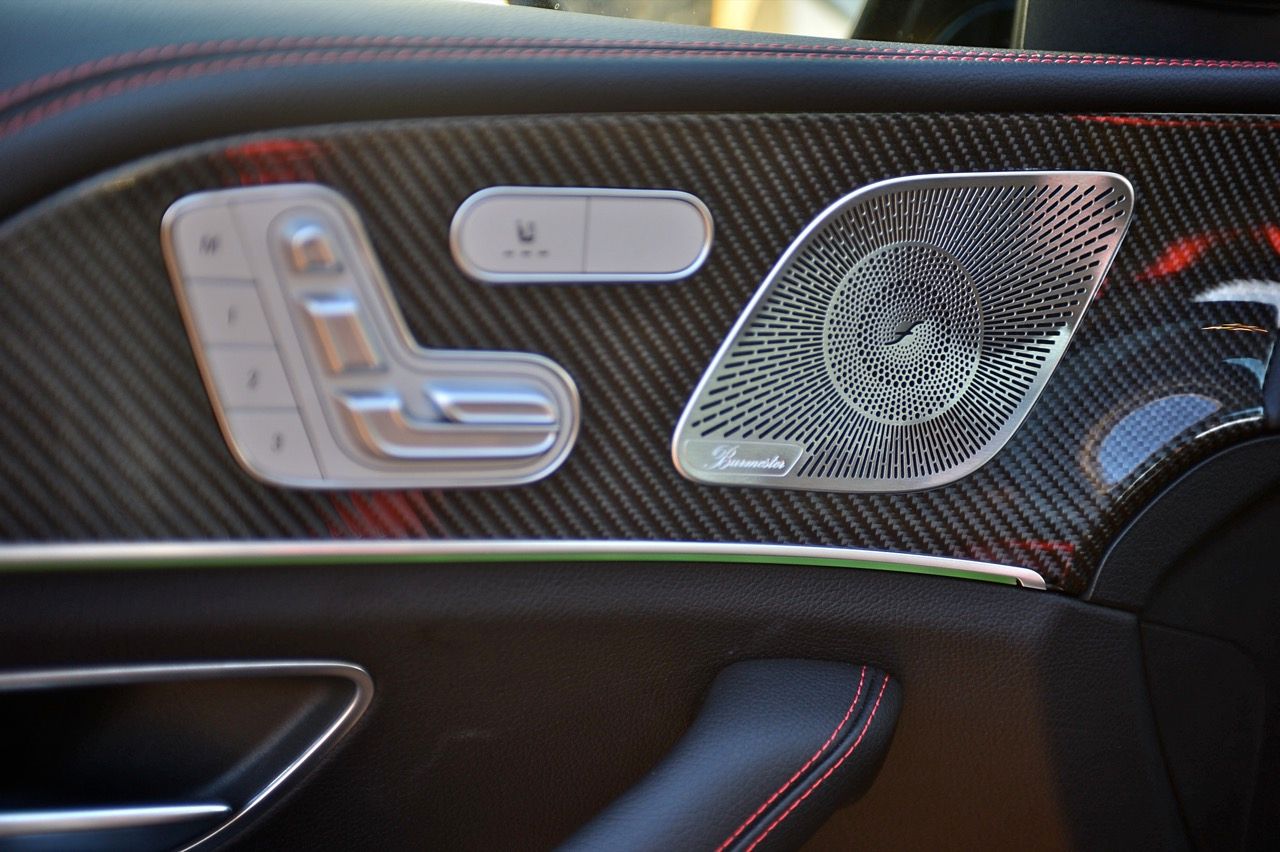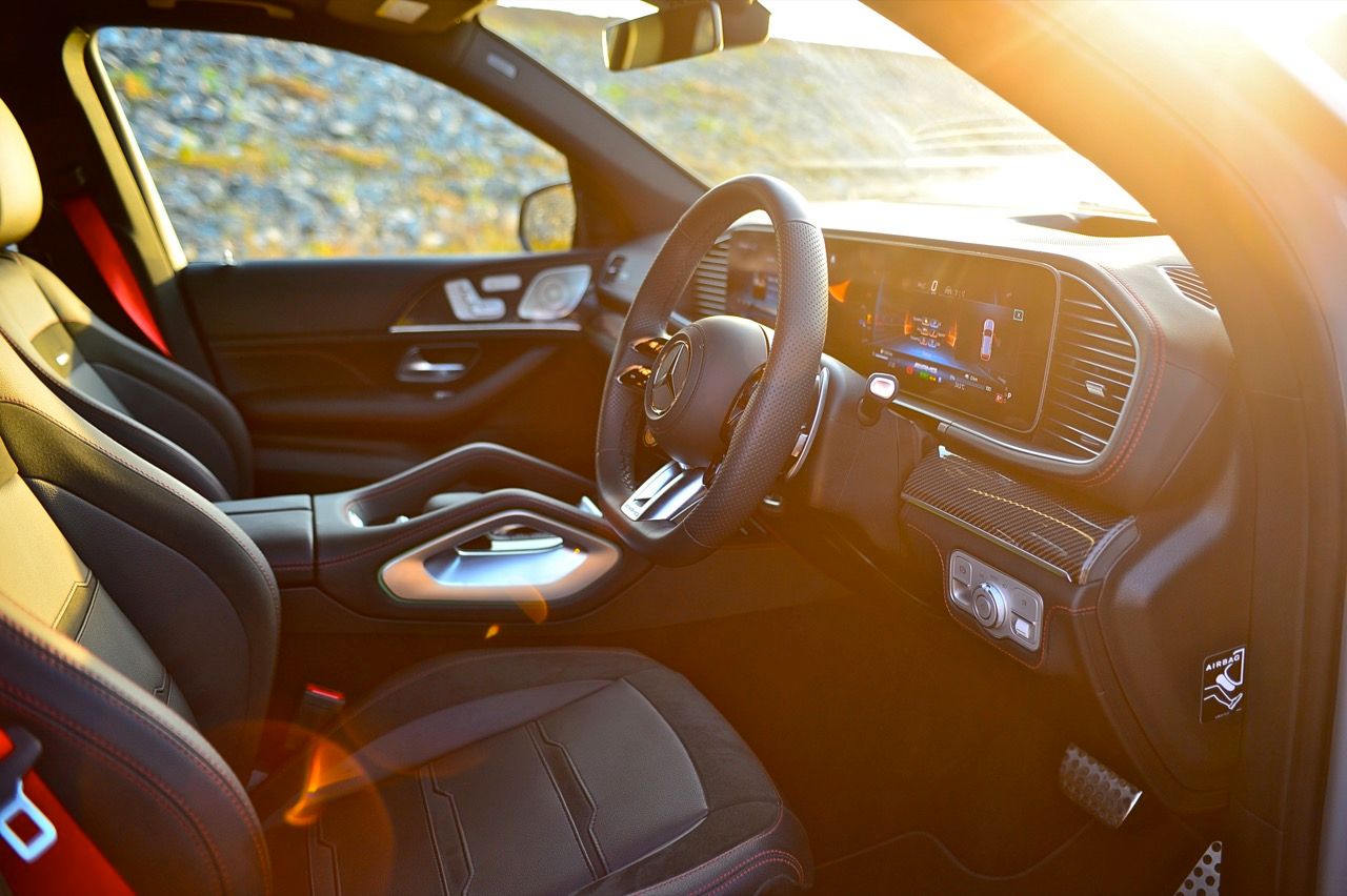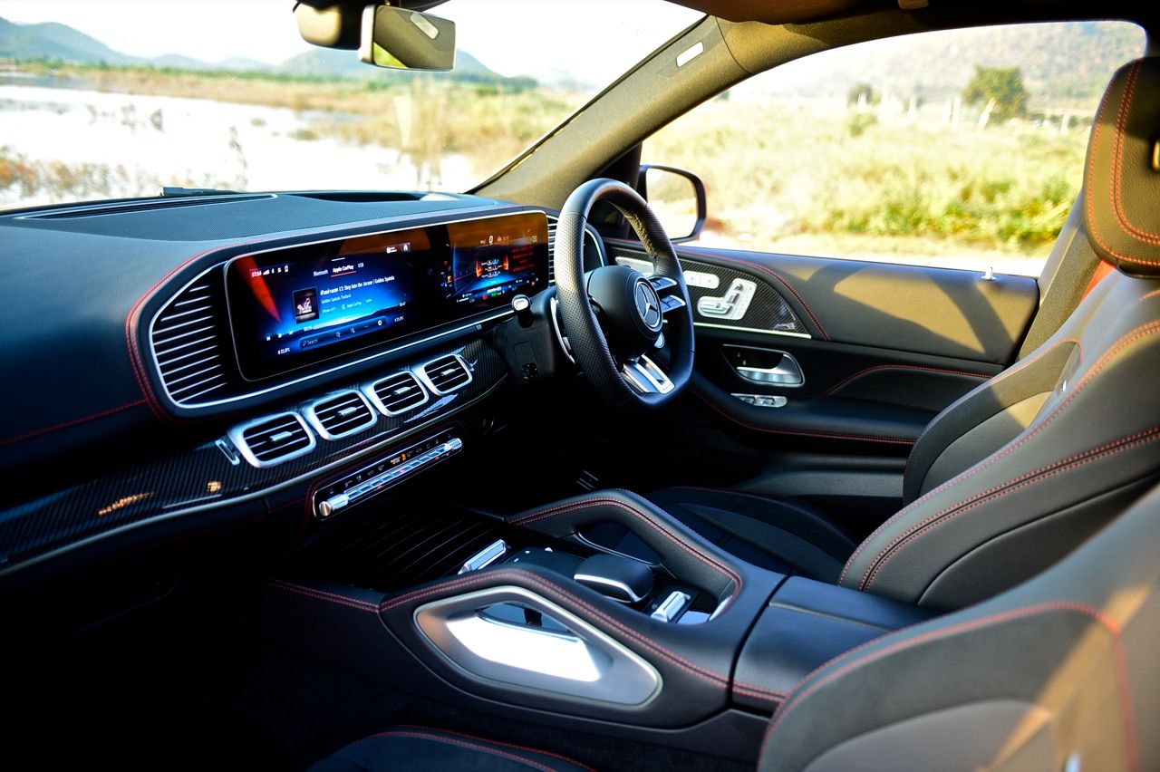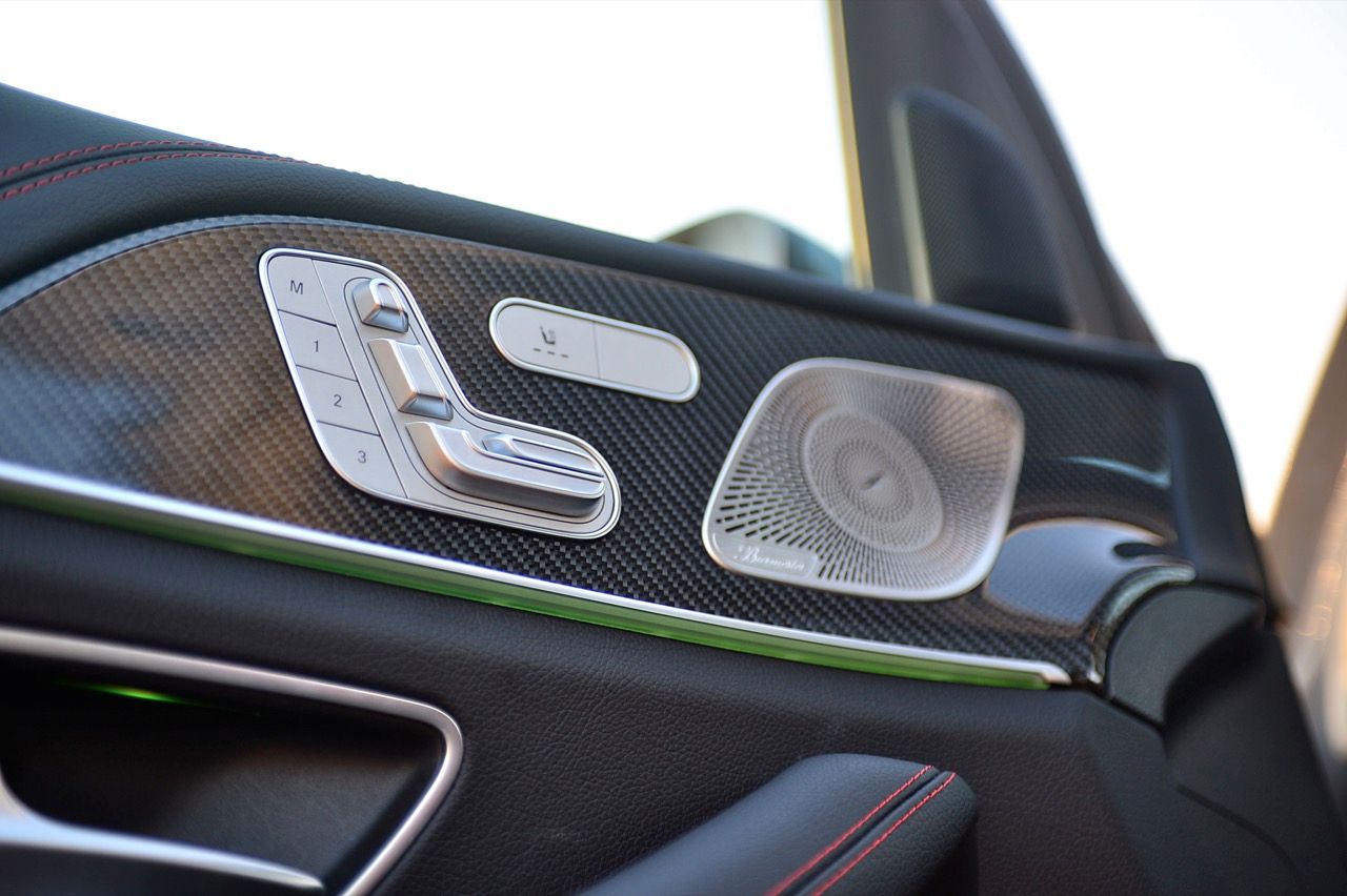 ห้องโดยสารมีอุปกรณ์ไฮเทคมากมายใช้งานไม่หมดเพราะเยอะมาก ไฟ LED รอบกรอบประตูที่เปลี่ยนเป็นสีต่างๆ ที่ผ่อนคลายหลังจากพระอาทิตย์ตกดิน คาร์บอนเคฟล่าห์เงาแวบให้สัมผัสลื่นไหลและดูสบายตา ระบบเสียงก็ดีมากและคอมพิวเตอร์ประจำรถก็เตือนเป็นระยะๆ ว่า “อย่าลืมมือถือ” ภายในตกแต่งแบบ AMG Night Package สี Deep gloss black