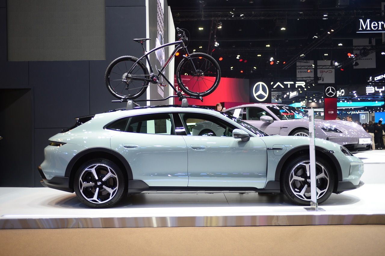 นอกจาก 911 GTS แล้ว บูธ Porsche ยังนำเสนอไลน์อัปรถยนต์รุ่นเด่นอีกหลากหลายรุ่น เช่น Porsche Taycan 4 Cross Turismo ติดตั้งแร็คจักรยาน (Bicycle Rack)