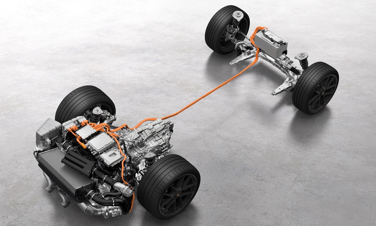 มอเตอร์ไฟฟ้าอีกตัวถูกติดตั้งอยู่ในระบบเกียร์อัตโนมัติ Porsche Doppelkupplung (PDK) 8 จังหวะ ทำหน้าที่ช่วยเสริมแรงบิดของเครื่องยนต์บ็อกเซอร์ได้สูงสุด 300 นิวตันเมตร เพิ่มกำลังขับเคลื่อน 40 กิโลวัตต์ ให้การ ตอบสนองของรถแม่นยำและเร้าใจ มอเตอร์ไฟฟ้าทั้งสองตัวทำงานร่วมกับแบตเตอรี่แรงดันสูงขนาด 1.9 กิโลวัตต์ชั่วโมง ชุดไฮบริดออกแบบให้มีน้ำหนักเบาเป็นพิเศษ เพื่อช่วยควบคุมน้ำหนักรวมของตัวรถให้คงไว้ซึ่งความสมดุล แบตเตอรี่ลิเธียมไอออนขนาดเล็กสำหรับระบบไฟฟ้าขนาด 12 โวลต์ แทนที่แบตเตอรี่ทั่วไป เพื่อลดน้ำหนักโดยรวมและเพิ่มประสิทธิภาพในการกระจายกำลังไฟฟ้าภายในระบบของรถอย่างเหมาะสมที่สุด ถือเป็นการผสมผสานเทคโนโลยีมอเตอร์สปอร์ตเข้ากับยนตรกรรมสำหรับการใช้งานจริงได้อย่างลงตัว